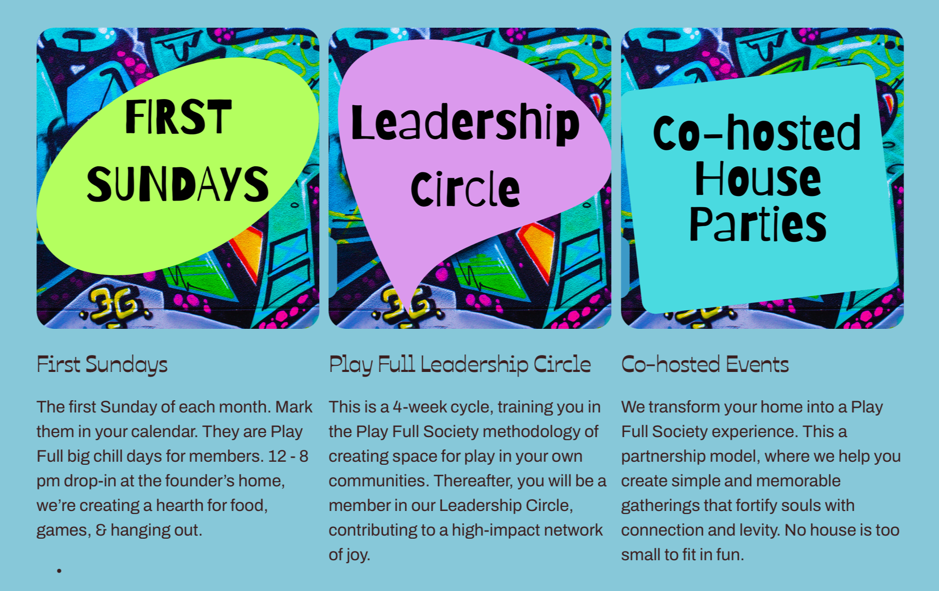 The Play Full Society connects the dots, bringing people together who value the power of joy as a life force that feeds everything else. Whether you are a game master or someone who dabbles here and there, we all deserve more deliberate time prioritizing play in our lives.